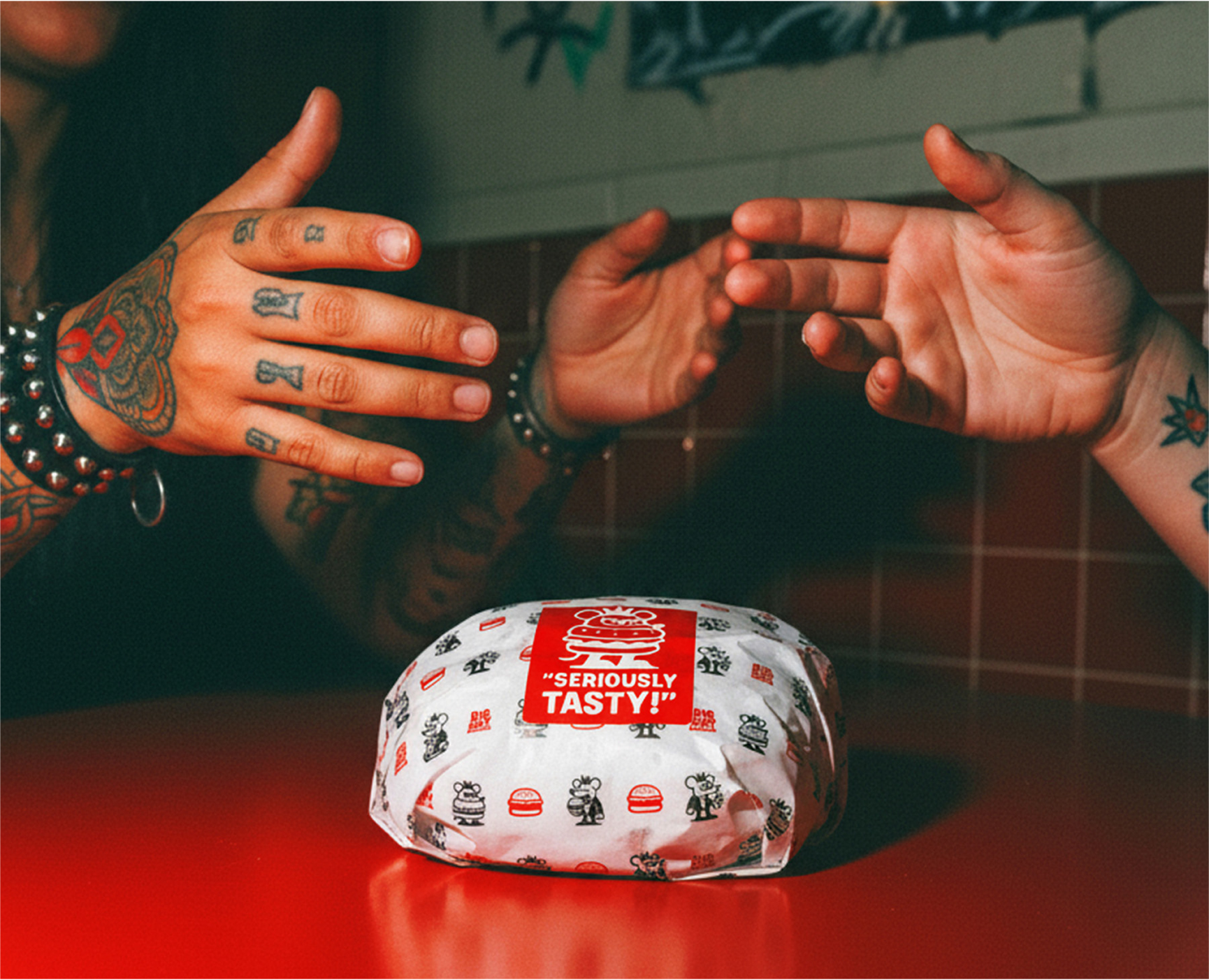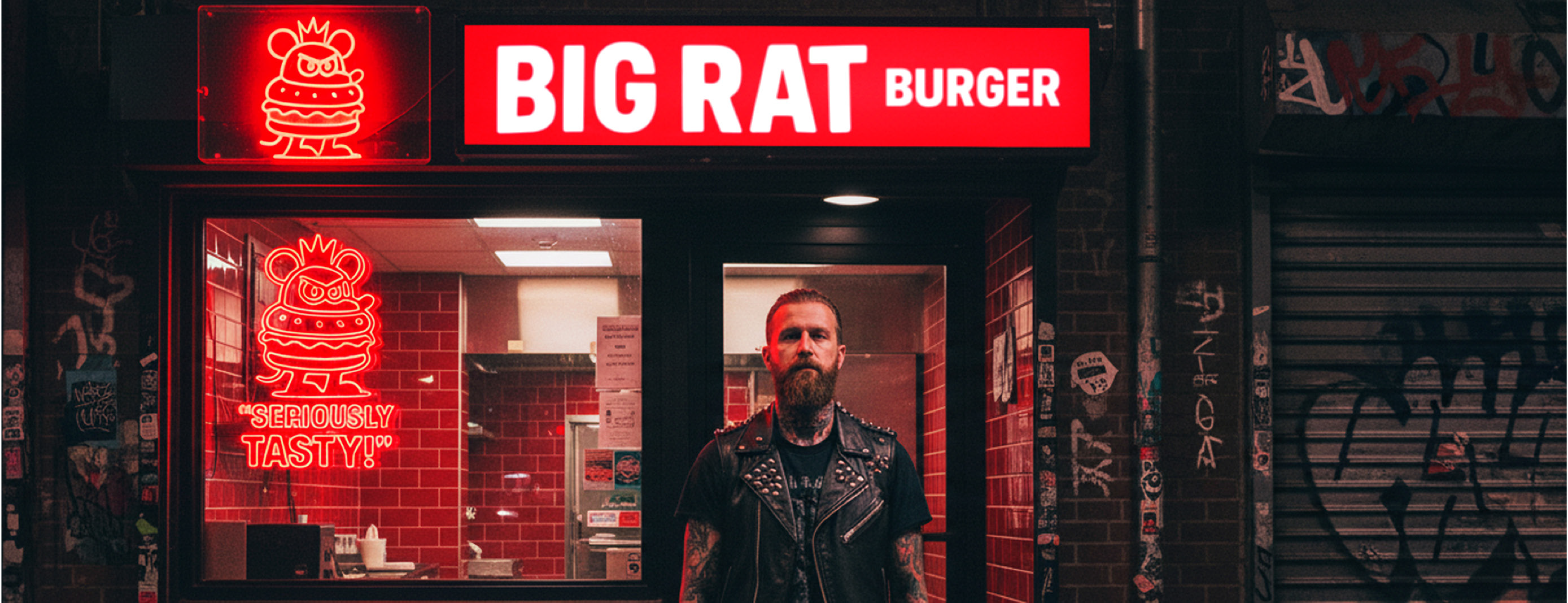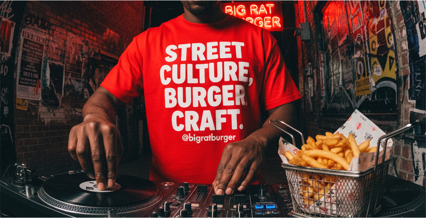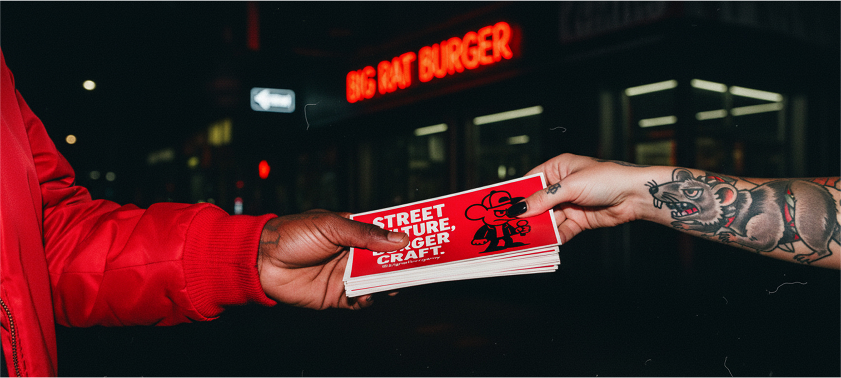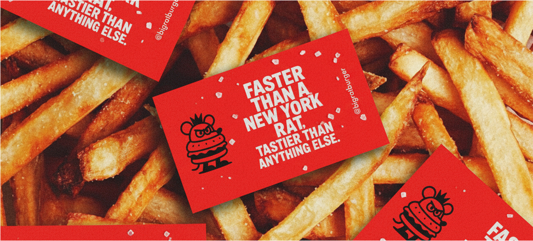 A linguagem do Big Rat Burger reflete seu propósito: ser o hub urbano do East Village, pulsando com a cultura de rua e conectando diretamente com quem vive o underground. O tom é provocativo, divertido e de efeito — brinca com a presença icônica dos ratos, a vida noturna e a atitude irreverente da marca.