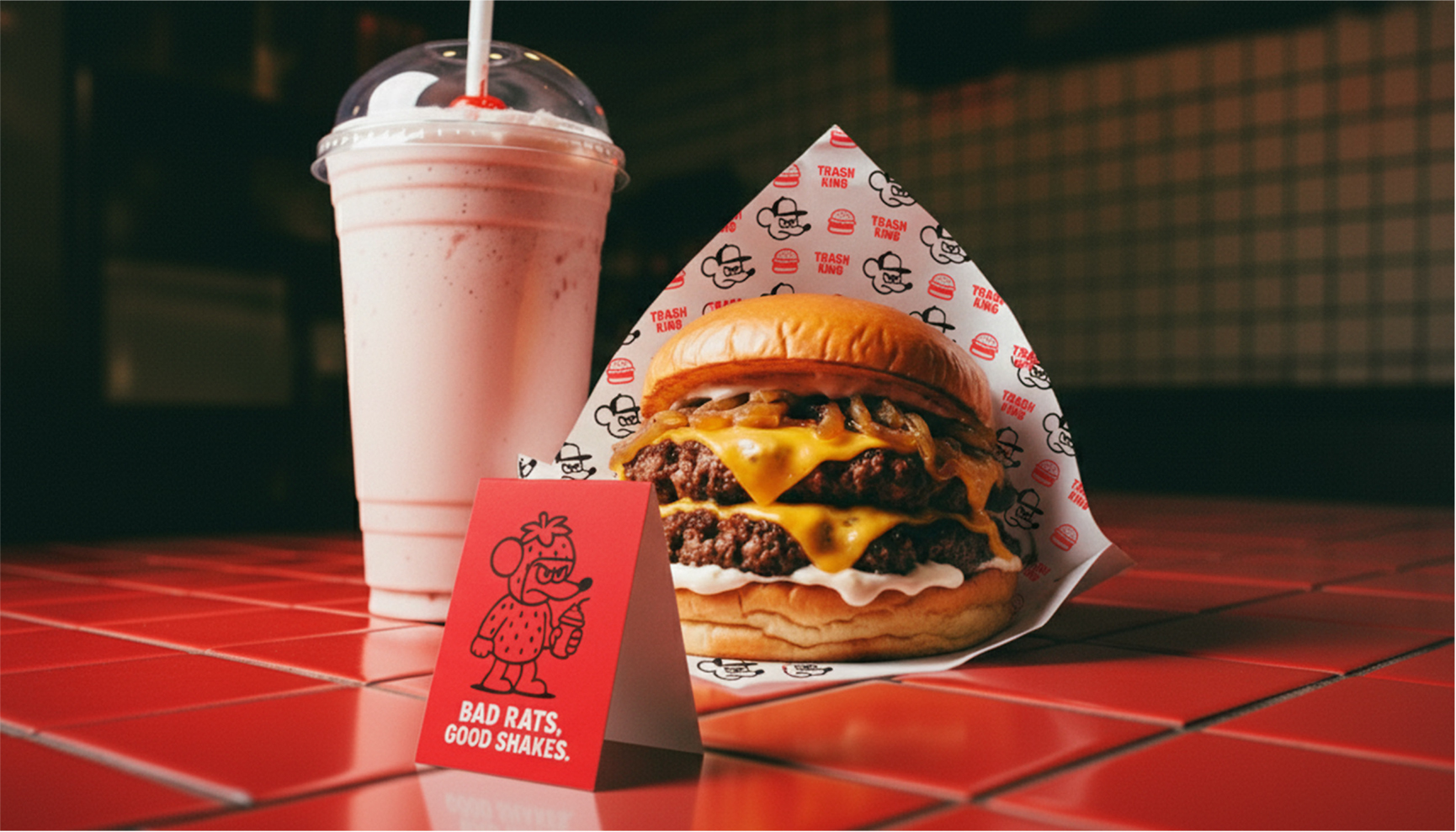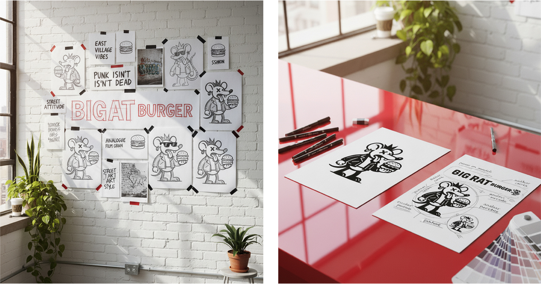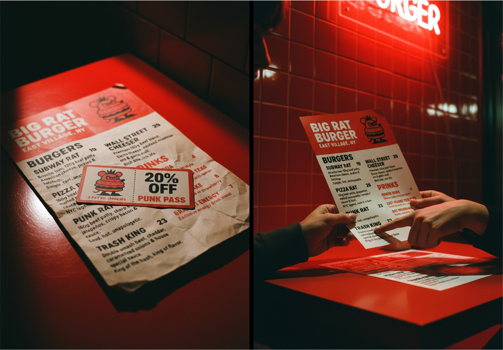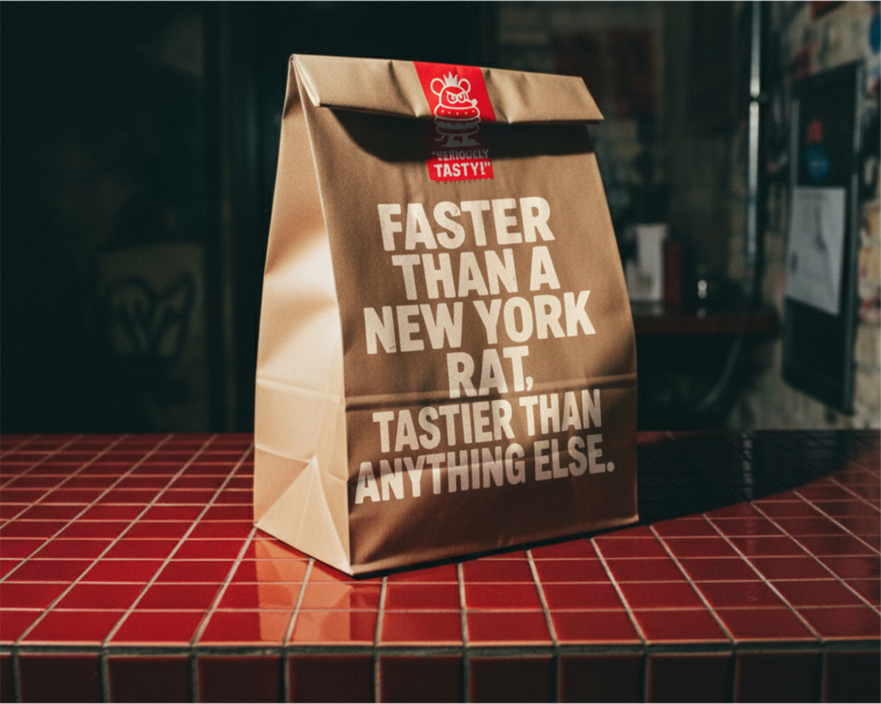 No processo de naming, percebi rapidamente uma afinidade criativa com Scott James, dono da hamburgueria: um verdadeiro ícone do punk nova-iorquino, cheio de ideias e histórias. Entre risadas sobre os grandes ratos que “dominam” as ruas de NY, enxerguei uma oportunidade estratégica. Propus transformarmos os ratos em parte central do conceito da marca, irreverente, underground e surpreendente.