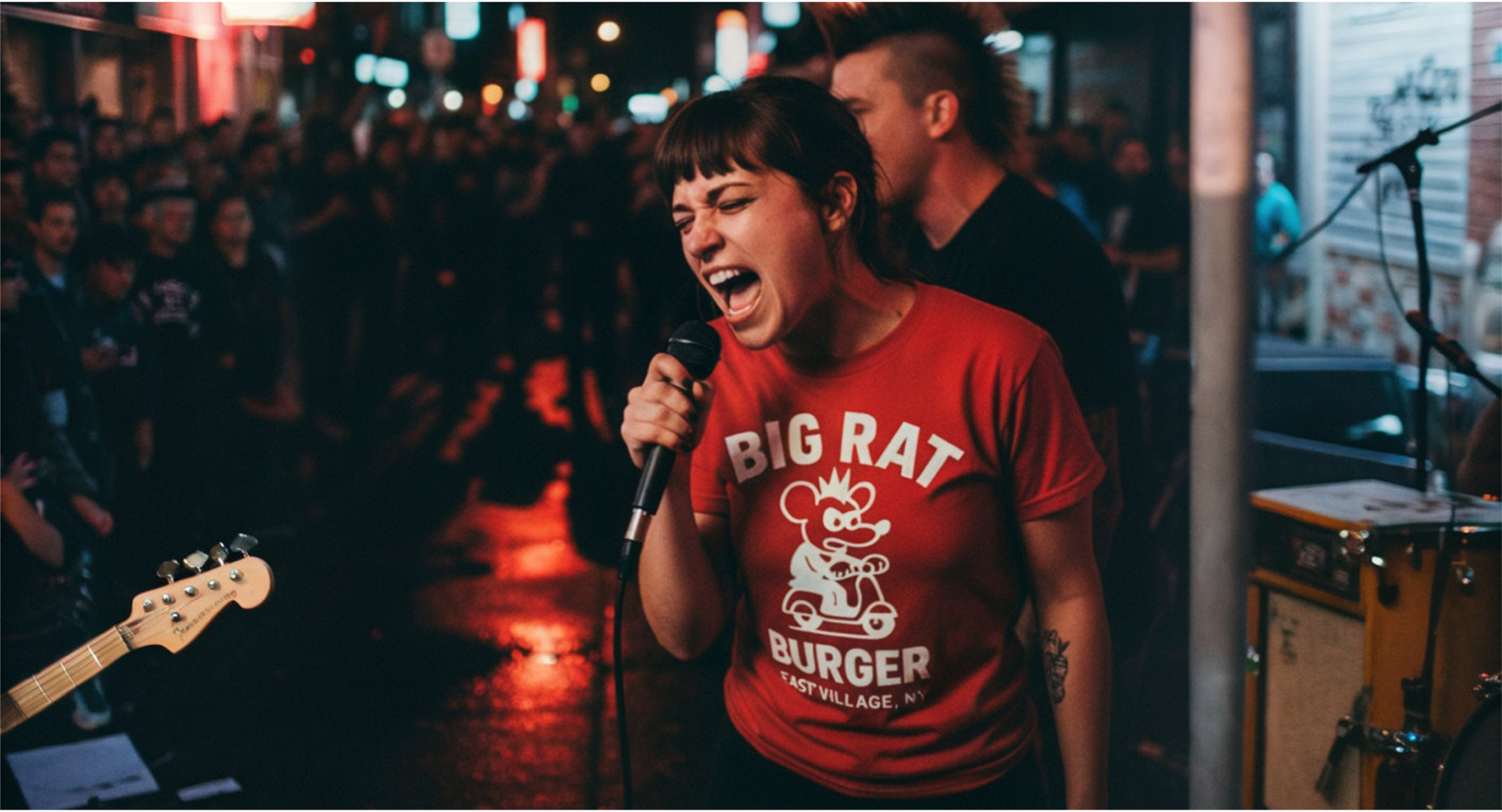 Para marcar a inauguração do Big Rat Burger, planejei uma programação que traduzisse a alma da marca. Convidei a Riot Queens, banda crossover formada por mulheres, que abriu a noite com atitude e energia. Logo depois, quem assumiu o som foi Jake Black, DJ local e figura icônica do East Village, já conhecido por dividir palco com grandes nomes do hip hop nova-iorquino.
