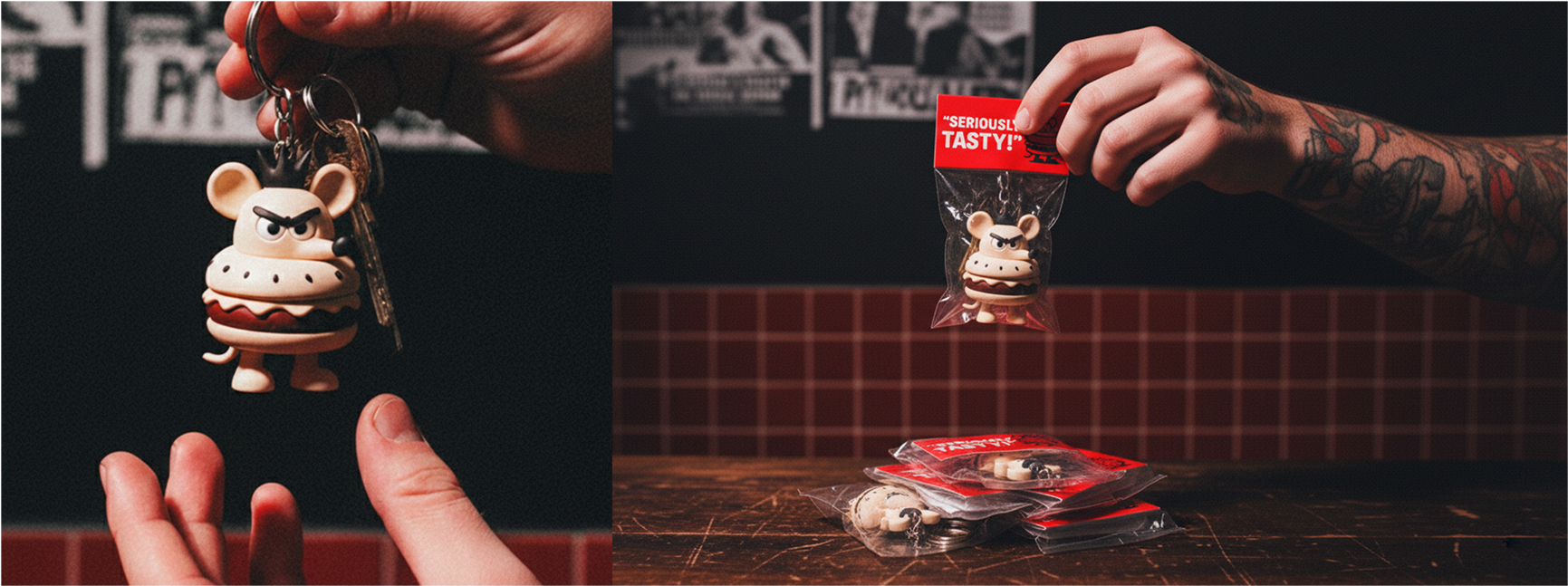 A experiência foi pensada para ir além da música: distribuímos brindes que conversavam de forma direta com o público, chaveiros com nosso mascote, camisetas e até um boneco de vinil exclusivo, que virou o prêmio de um inusitado concurso de “quem come mais hambúrgueres”. A estratégia era clara: transformar a inauguração em ponto de encontro, criando memórias culturais e emocionais ligadas à marca.