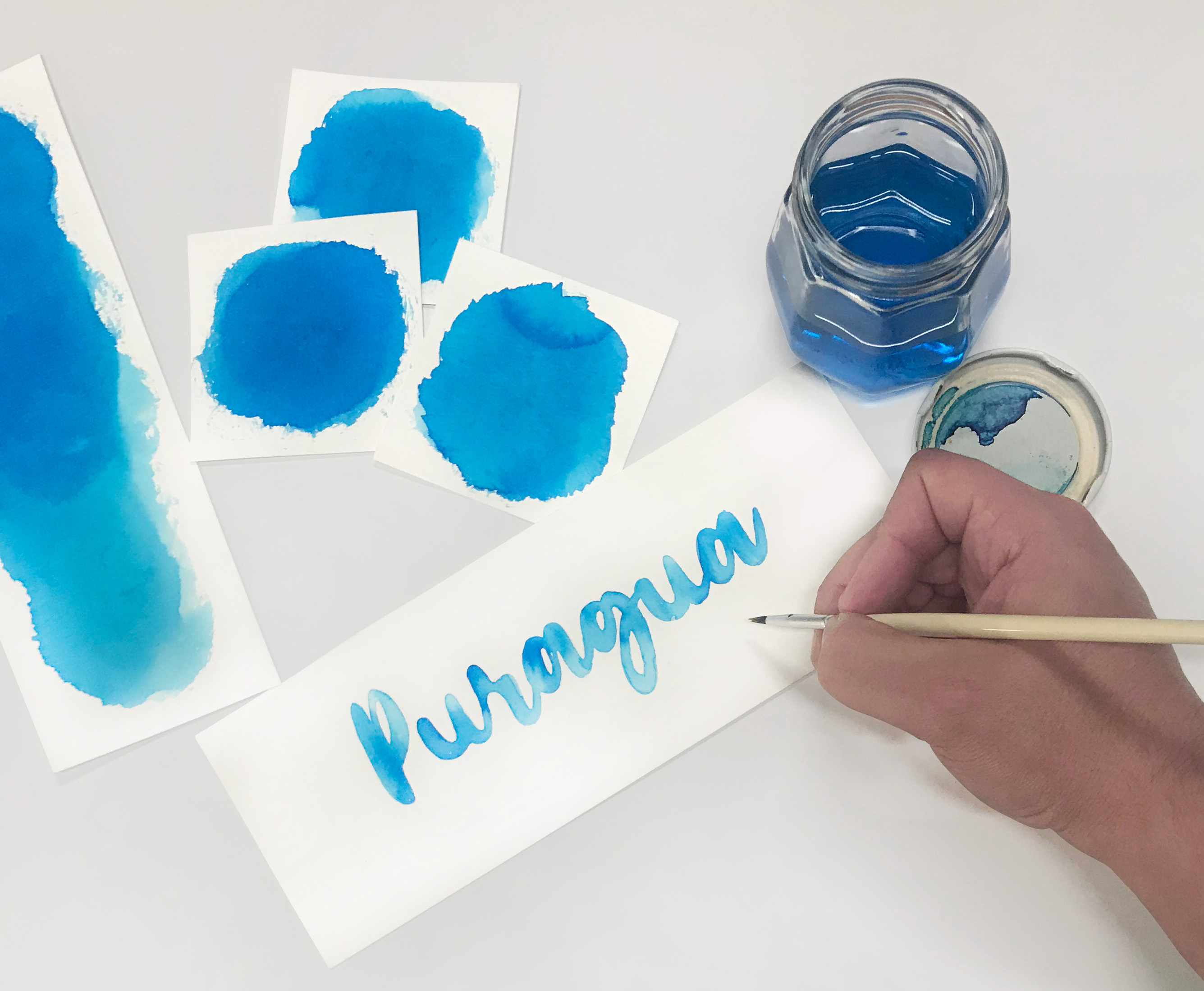 Durante o processo de criação percebi que usar o proprio produto (água) para desenhar o logotipo, traria algo único, leve, lúdico e com um aspecto flúido, foi ai então que, com aquarela e após diversas pinturas cheguei ao resultado do logotipo Purágua.