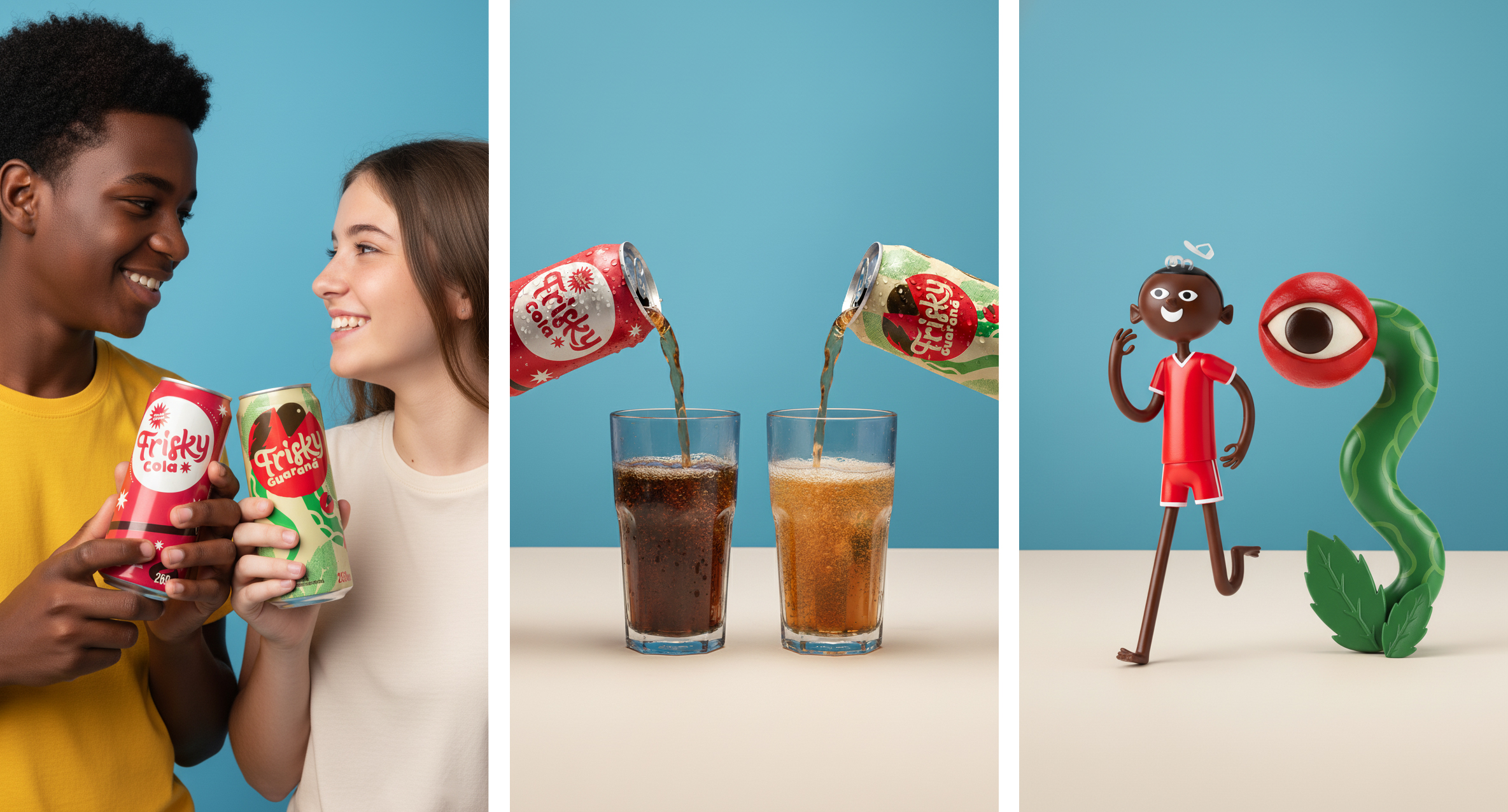 Com o redesign do logotipo aprovado e a proposta narrativa dos sabores cola e guaraná bem recebida, a empresa percebeu seu próprio potencial de comunicação. A partir dali, o projeto evoluiu naturalmente: cada novo sabor tornou-se uma oportunidade de ampliar o universo Frisky, continando a conectar produto, território e imaginação.