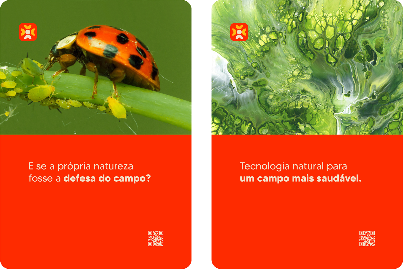 Essa paleta, somada ao símbolo, é estratégia de identidade. Um conjunto pensado para comunicar ciência e natureza em equilíbrio, traduzindo o posicionamento como agente pioneiro de uma nova agricultura — mais viva, inteligente e necessária.