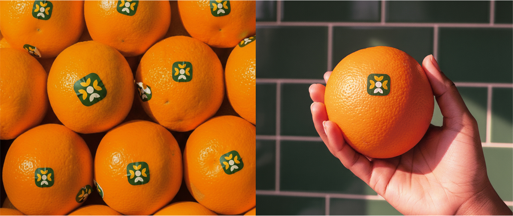As cores complementam esse discurso com significado: o laranja terroso conecta-se à ideia da terra fértil, origem de tudo; o verde simboliza a vitalidade natural e a tecnologia biológica que substitui o uso de químicos; já o amarelo traz luz e otimismo, representando a energia de um futuro agrícola mais saudável e sustentável.